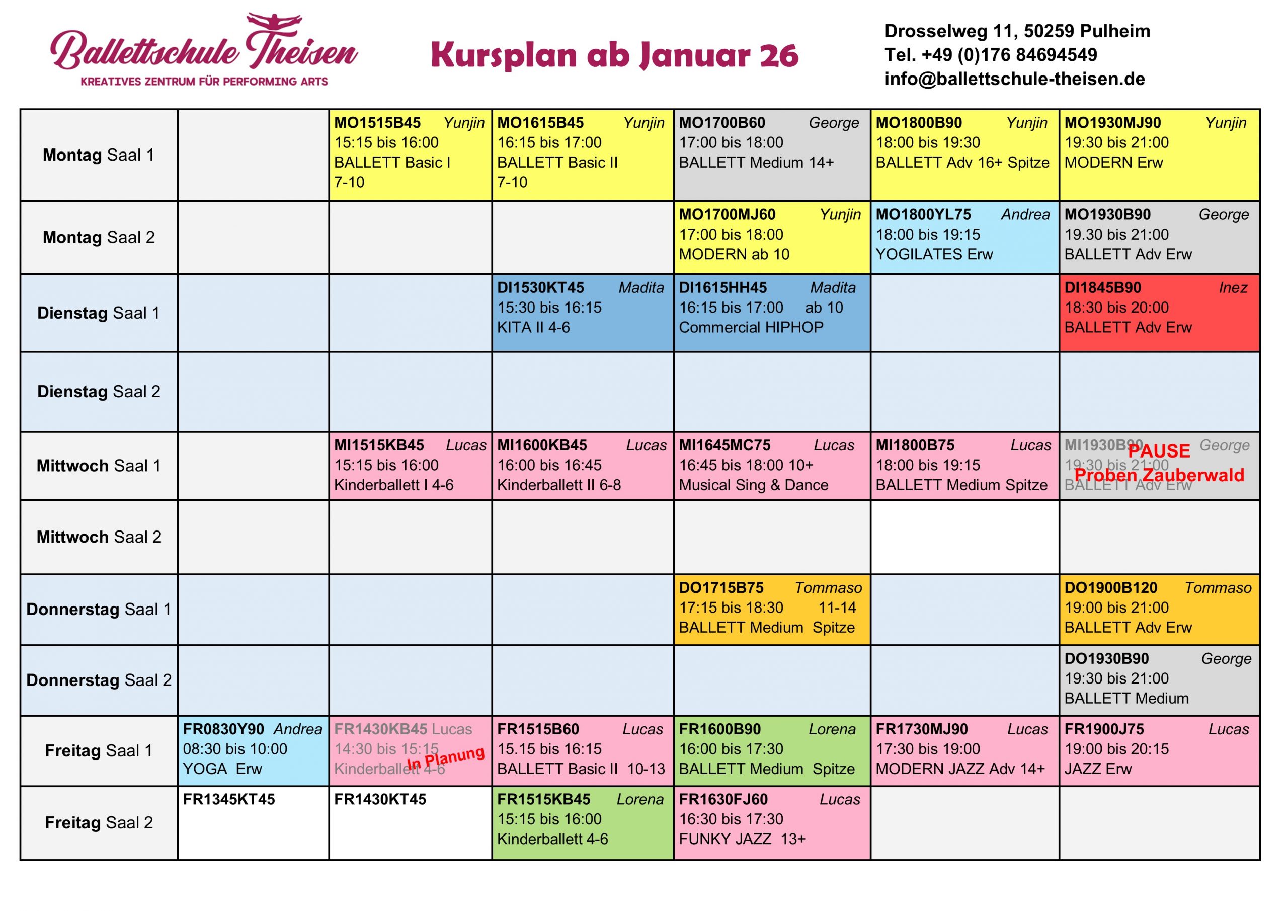 Unser Kursplan bietet inspirierende Kurse für alle Niveaus und Altersgruppen. Finde Deinen perfekten Kurs und starte Deine Tanzreise mit uns! Ist Dein Kurswunsch noch nicht in unserem Programm? Sprich uns gerne an. Es bestehen bereits Interessentenlisten für unsere neuen Kurse.